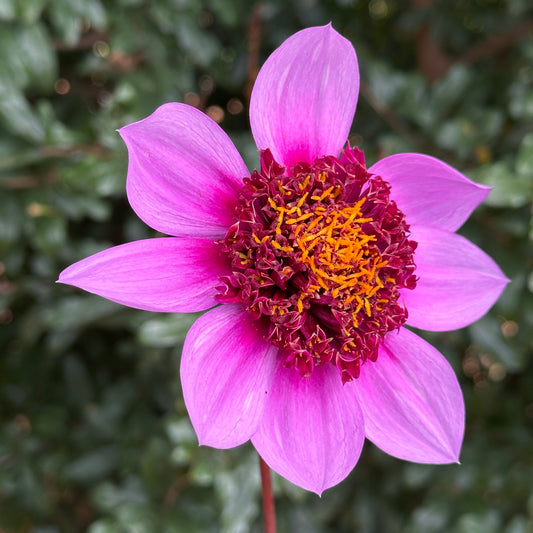 The blooms of anemone-flowered dahlias have one or more rows of ray petals. The centre of the flower is formed by tightly clustered, fairly long disc petals.